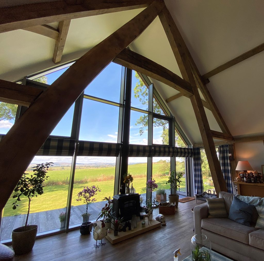 The oak cruk frame creates a lovely double height space with stunning views over the countryside.