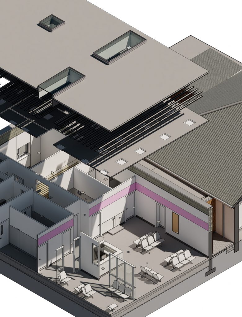 The look of the bungalow was completely transformed by a flat roof with rooflights, generous window openings and timber cladding to the outside, all to give a new and modern identity to the surgery.